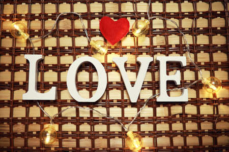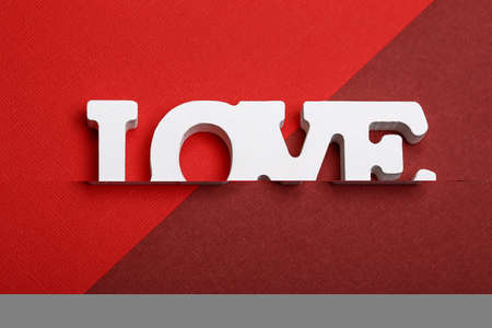 Valentine day love concept. Word love made from wooden letters on red paper background