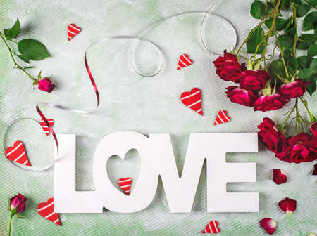 Festive composition of love for Valentines day made with red roses, hearts and word Love. Flat lay.