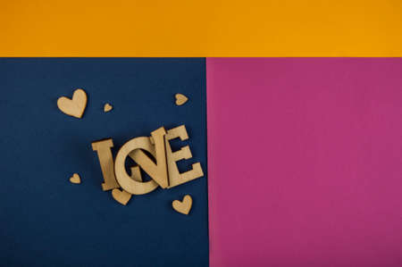 Love word, small hearts on colorful paper background. Top view of Valentine's Day. copyspace.