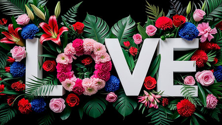 Word LOVE made of flowers and palm leaves on black background. Valentines day concept