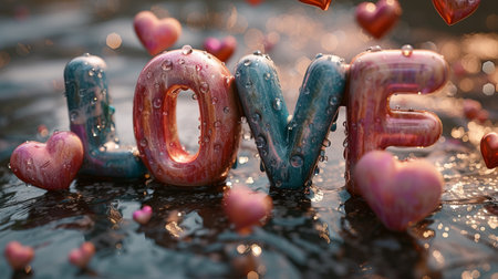 A colorful image of hearts with the word LOVE written in gold letters. Concept of love and warmth, with the hearts and the gold letters creating a visually appealing and romantic atmosphere