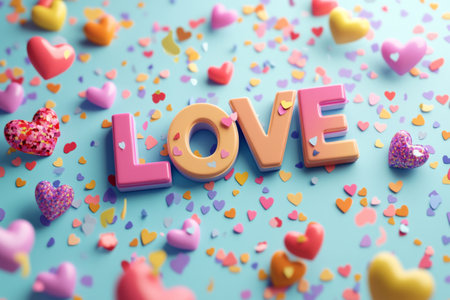 Romantic composition with colorful Text LOVE surrounded by floating small hearts and confetti on vibrant background
