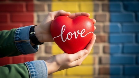 Hands holding a red heart with the word love on the background of the flag of Belgium