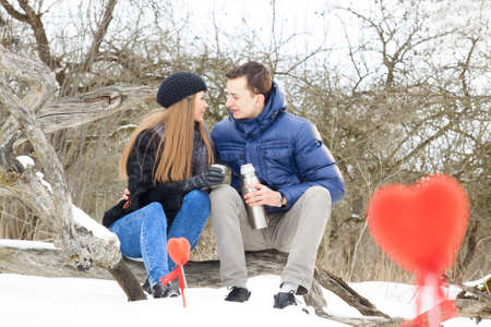 Beautiful adult couple in forest sitting an drinking tea