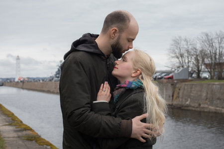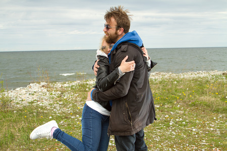 Loving man and woman couple hugging each other kissing at seaside