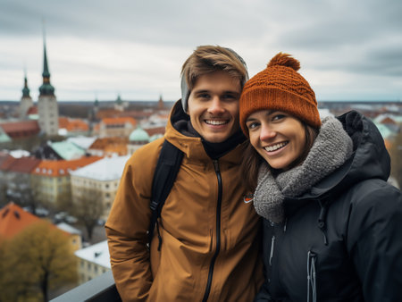 travel concept - two tourists in love walking in old town of Tallinn, Estonia