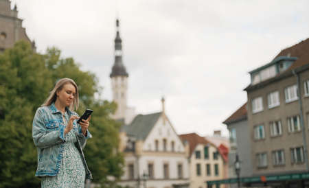 Woman with smartphone in the old city.