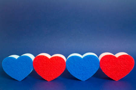 Four red and blue heart shape dishwasher sponge in the foreground on the blue background.