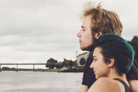 young happy loving couple on the river bank