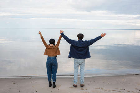 Back view of young couple holding hands on beach near sea in autumn