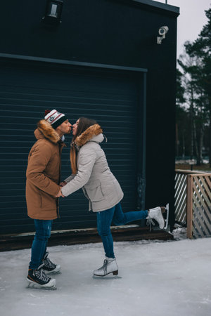 A couple shares a warm kiss while ice skating outdoors, surrounded by a beautiful winter landscape.