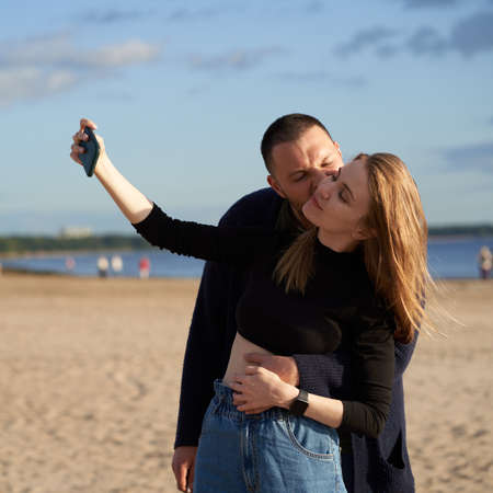 Couple having fun and taking selfie photo on mobile phone on sandy beach in summer or autumn. Handsome man bitting pretty female with long hair