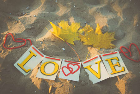 Fall. Love stories. The inscription Love Story on the background of yellow maple leaves on the sand.