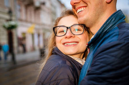 Young fashion elegant stylish couple, travel by old European cities, posing hugging each other, smiling, girl in glasses, selfie