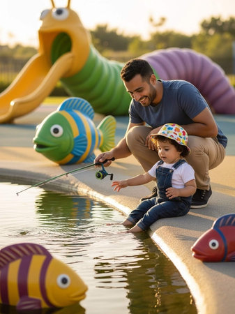 A man and a toddler enjoy a fun fishing game at an outdoor playground with vibrant play equipment on a sunny day, promoting quality time and childhood wonder.