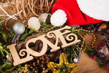 Word love in wood type with Christmas tree branches, love concept. Vintage style