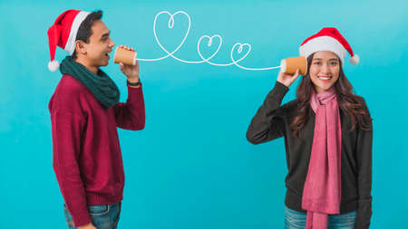 Young Asian couple wearing Santa Claus hat.Using can phone talking together isolated on blue background in studio shot.Christmas celebration of lover concept.