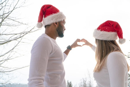 holiday Christmas photo of beautiful tender couple in warm clothes and Santa hat