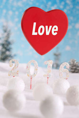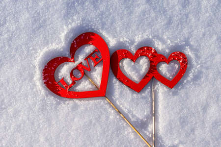 Love message in the form of figurines of hearts on the snow on Valentine's Day