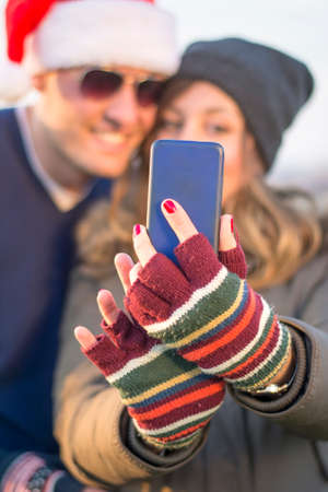 A couple in the new year calls on the phone to congratulate by video link. A girl and a guy in a santa hat. New mountains and Christmas.