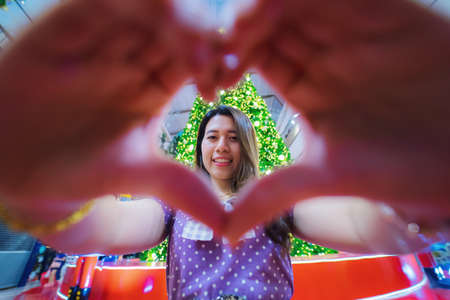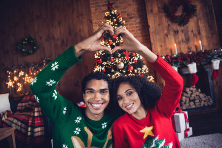 Photo of two positive peaceful partners toothy smile hands touch show heart gesture christmas evergreen tree garland indoors