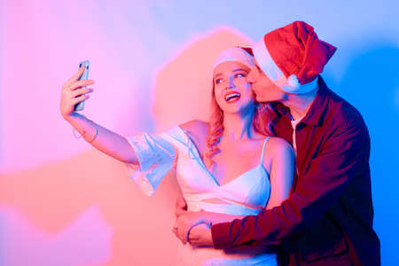 Couple in santa hats, new year, christmas. Lovers in neon light. Surprised couple looking to the side at empty space for text