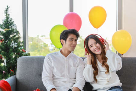 Happy New Year, Xmas and couple concept. Asian young man and woman listen music with red headphone and sitting on sofa in christmas party