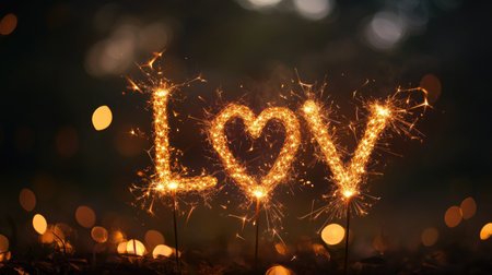 A captivating display of sparkling lights forms the word LOVE using bright fireworks. The warm glow is highlighted by soft bokeh lights against a dark background, creating a magical and romantic atmosphere perfect for celebrations.
