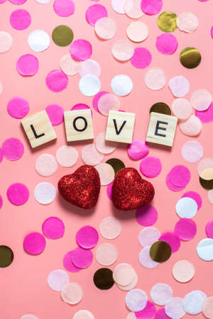 card for valentine's day. on a pink background wooden letters lined with love. funny congratulations. Flat lay, top view. red shiny hearts.