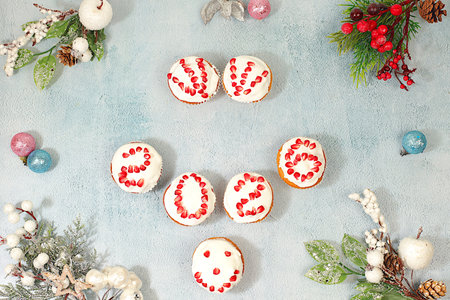 Top view of a couple making heart shape with their hands around a holiday cookie placed on rustic wooden desk full of Christmas ornaments.