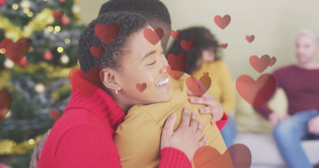 Image of hearts over african american couple embracing at christmas. Christmas tradition and celebration concept digitally generated image.
