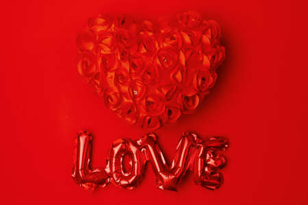 Valentine day love concept. Word love made from wooden letters on red paper background