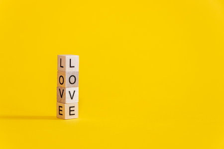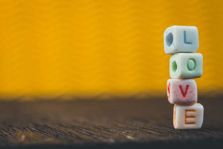 Wooden cubes with the word Love on a colorful yellow background.