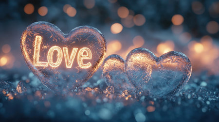 Intricately carved ice hearts, inscribed with the word Love, sparkle in warm light against a backdrop of glittering ice. This enchanting display evokes romance during a winter event.