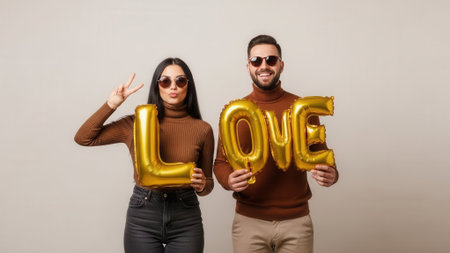 A happy couple poses for a photo, holding large golden balloons that spell out LOVE. They are both wearing sunglasses and casual attire.