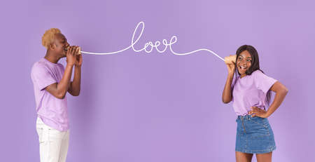 Millennial black couple sending each other love message through tin can phone, lilac background. Panorama