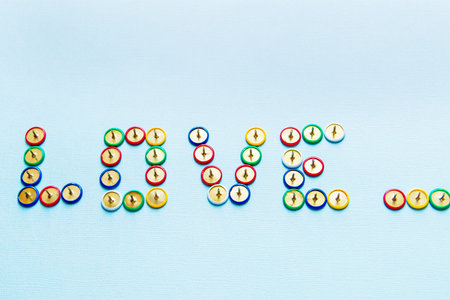 word love from pins collection of stationery multicolored buttons, love theme.