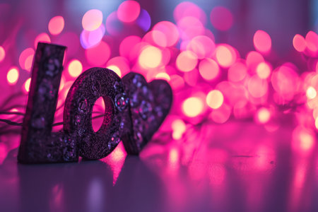 Lettering Love bright glitter lights bokeh background.