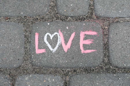 Lettering LOVE made iwith chalk on the road.