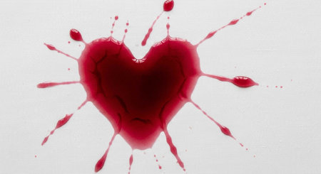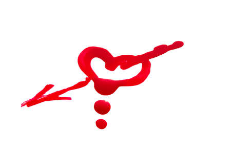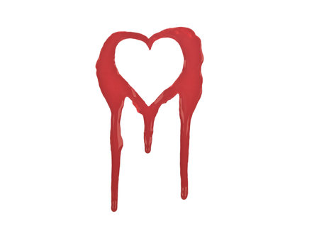 Heart-shaped blood on white background. Red heart, frozen in ice, melting.