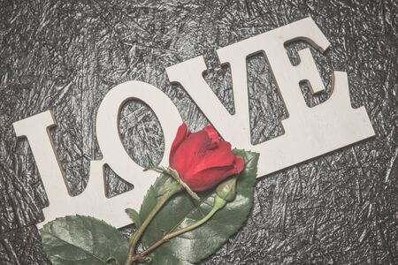 Romantic background with word love and red rose. Valentine's day greeting card. Vintage toned photo.
