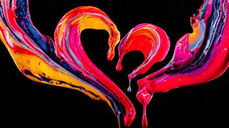 Vibrant, flowing paint tendrils create intertwined heart motifs, their lively hues contrasting sharply with a dark backdrop, evoking feelings of love and passion.