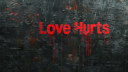 Moody Grunge Art with Dripping Red Text Love Hurts on Dark Textured Background. Concept of Heartache, Emotional Expression, Urban Aesthetics, and Grunge Style.