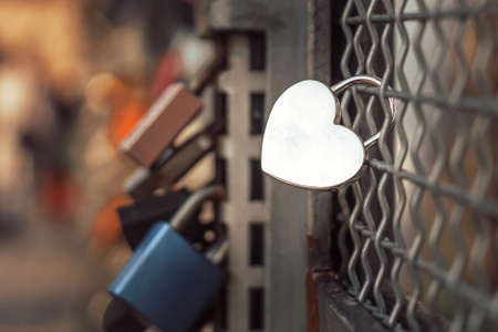 Many love padlocks locked on iron railing on a blurred background. Tourists place. Love sign and romance concept.