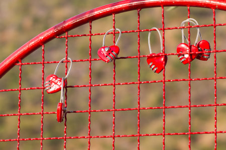 Closeup of red padlocks in shaped heart on metallic cable in border water