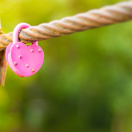 Pink Wedding closed lock in the form of heart. The castle weighs in at a bridge on a blue sky background on a bright Sunny day.