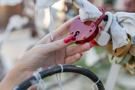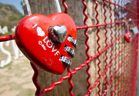 Wedding red lock with heart on a handrail. Symbol of marriage.