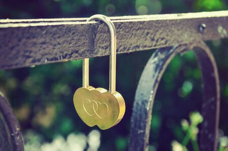inspiring spring morning. Old padlock - the heart. attached to the fence by the lake. in a city park. concept of love.toned