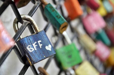 Many Love locks on fence symbol of eternal love, friendship and romance.