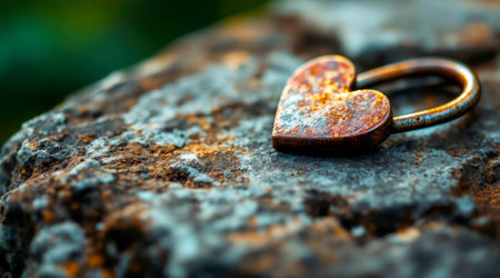 A heart-shaped lock sits on a rough stone. The lock shows signs of rust and wear. Behind it, green plants blur in the background. The scene captures a moment in nature.